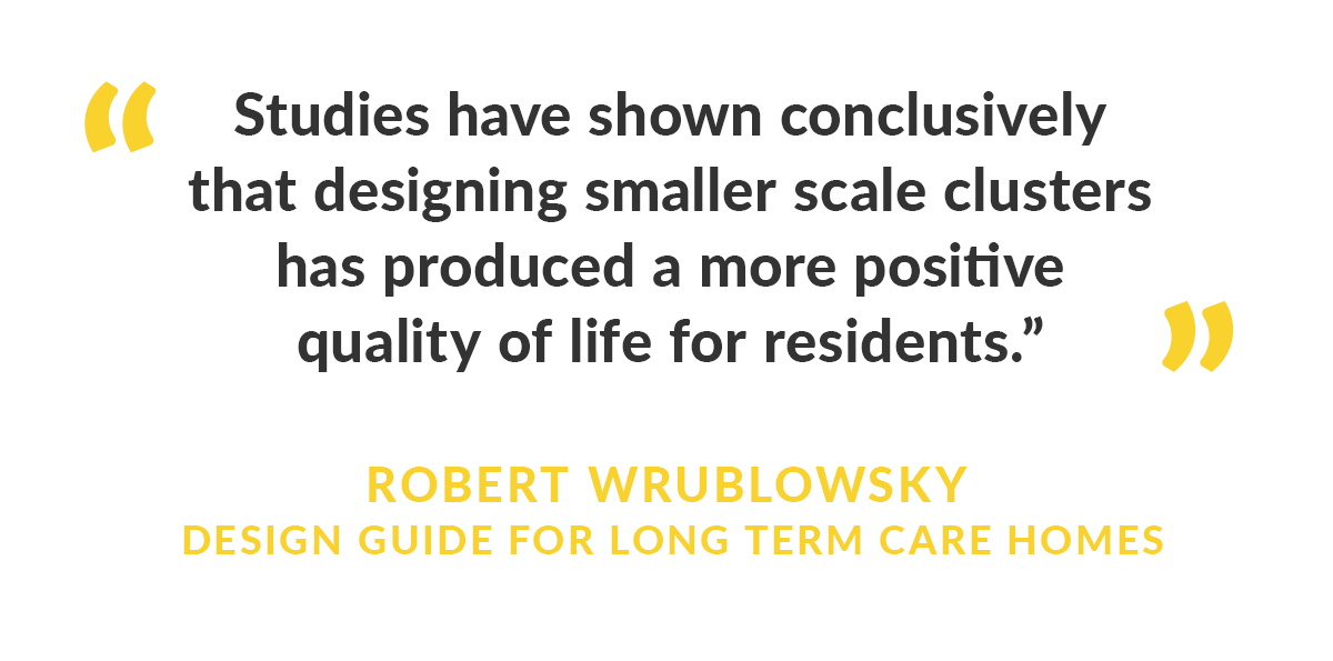This approach seems more intuitive, more comfortable, and more well-rounded. According to the Design Guide for Long Term Care Homes, “Studies have shown conclusively that designing smaller scale clusters has produced a more positive quality of life for residents.”