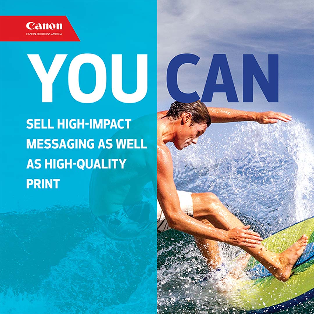 So far, we’ve demonstrated the agility of this popular marketing campaign across a wide range of media—from print ads and magazine onserts to all kinds of digital advertising, segmented email campaigns, custom landing pages, direct mail, and video—earning industry attention and accolades in the process. But for this project, our creative team was challenged to stretch the campaign’s visual identity even further. The job called for four 10 ft. by 10 ft. signs to frame the entrance to the section of the Customer Innovation Center where Canon’s impressive production printing presses are set up, plugged in, and ready to run live printing demos.
